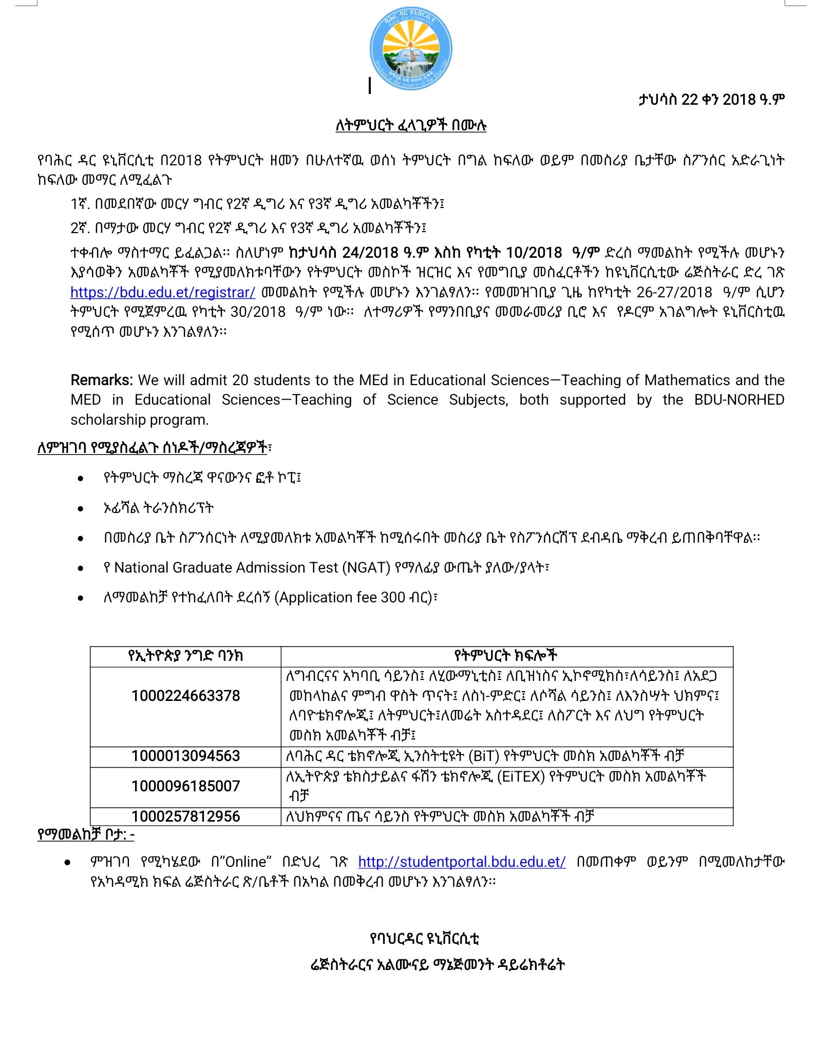 ተቀብሎ ማስተማር ይፈልጋል፡፡ ስለሆነም ከታህሳስ 24/2018 ዓ.ም እስከ የካቲት 10/2018 ዓ/ም ድረስ ማመልከት የሚችሉ መሆኑን እያሳወቅን አመልካቾች የሚያመለክቱባቸውን የትምህርት መስኮች ዝርዝር እና የመግቢያ መስፈርቶችን ከዩኒቨርሲቲው ሬጅስትራር ድረ ገጽ https://bdu.edu.et/registrar/ መመልከት የሚችሉ መሆኑን እንገልፃለን፡፡ የመመዝገቢያ ጊዜ ከየካቲት 26-27/2018 ዓ/ም ሲሆን ትምህርት የሚጀምረዉ የካቲት 30/2018 ዓ/ም ነው፡፡ ለተማሪዎች የማንበቢያና መመራመሪያ ቢሮ እና የዶርም አገልግሎት ዩኒቨርስቲዉ የሚሰጥ መሆኑን እንገልፃለን፡፡